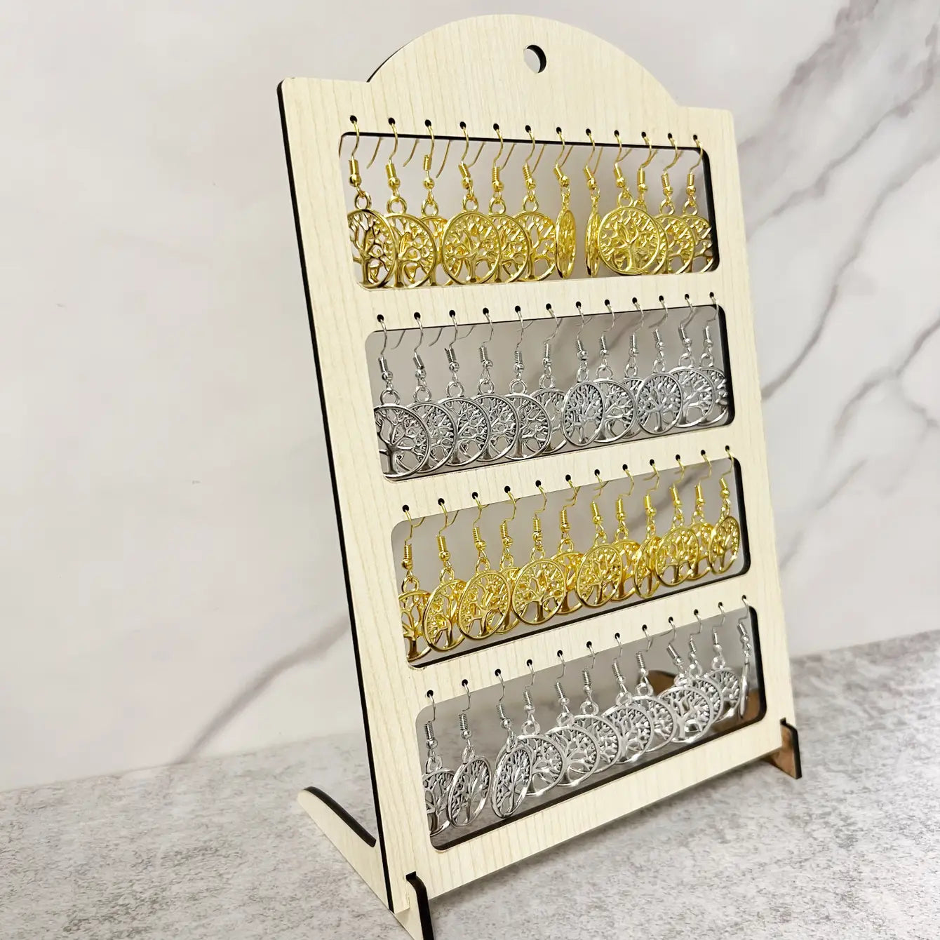 1 case contains 24 pairs of earrings and a wooden display.