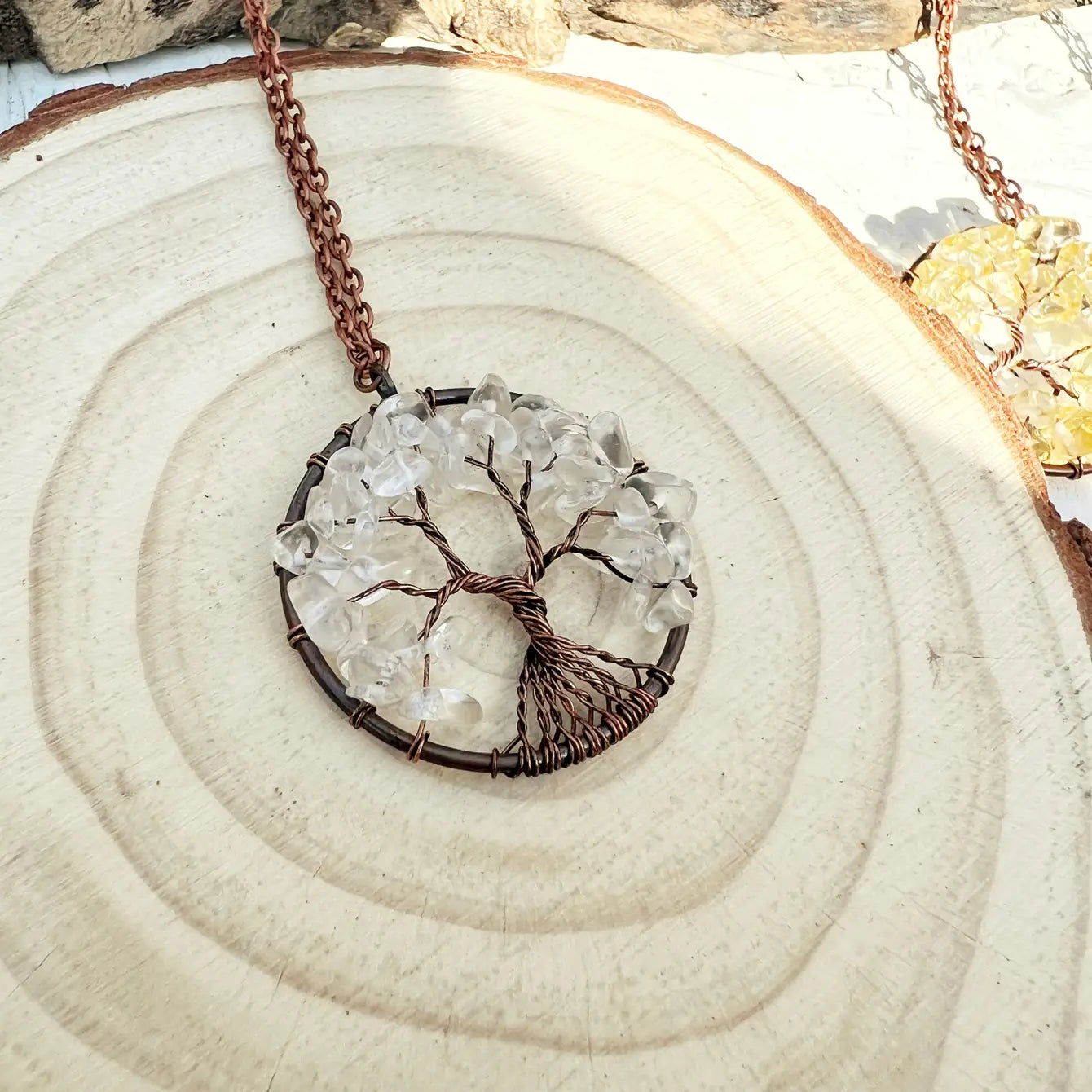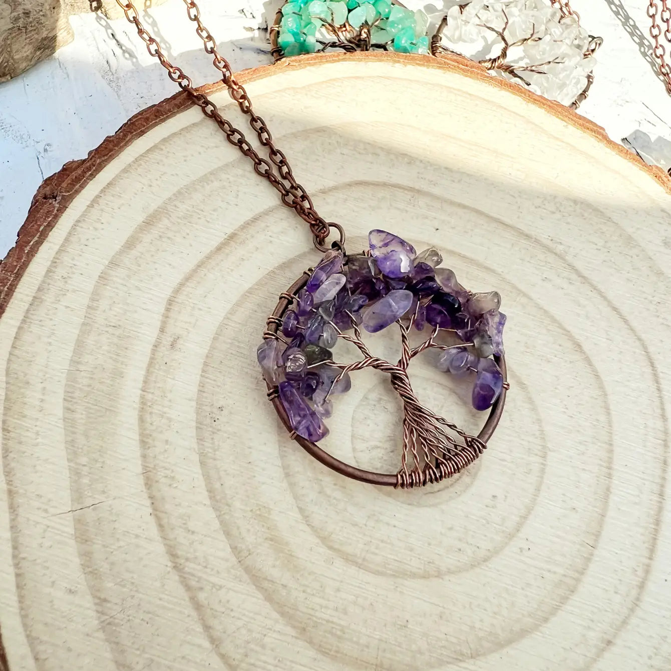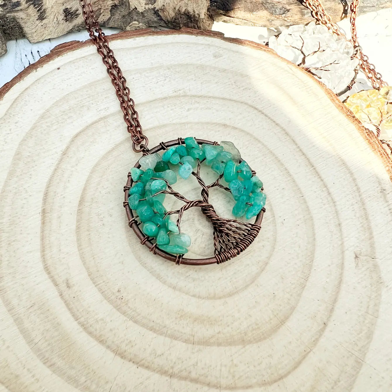 The cooper tree of life gemstone necklace assortment features twelve beautifully handmade necklaces that are perfect for adding a touch of elegance and charm to any outfit. The pendant is crafted from copper and features branches that form the shape of a tree with a gemstone at its center. The tree of life symbol is often associated with wisdom, strength, and growth, making it a meaningful and inspiring accessory to wear.The chain is adjustable which makes it a perfect length for most neck sizes.