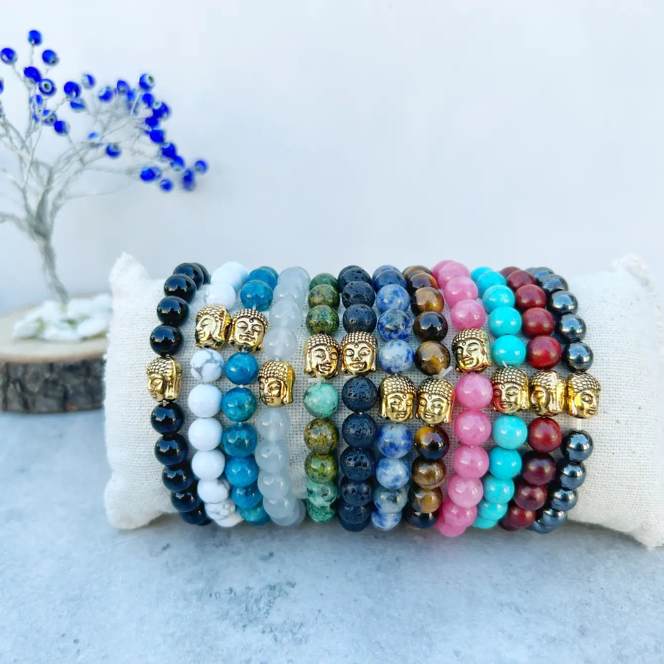 If you're looking for an easy-to-wear, adjustable, and handmade gemstone bracelet to help you feel serene and happy, this is it! Inspired by the beauty of ancient Buddhist symbols, the buddha bracelet is a hand-crafted, one-of-a-kind accessory perfect for everyday wear. Made with high quality gemstones , the bracelet features an antique bronze buddha head and 8mm beads. The size is adjustable to fit almost any wrist.