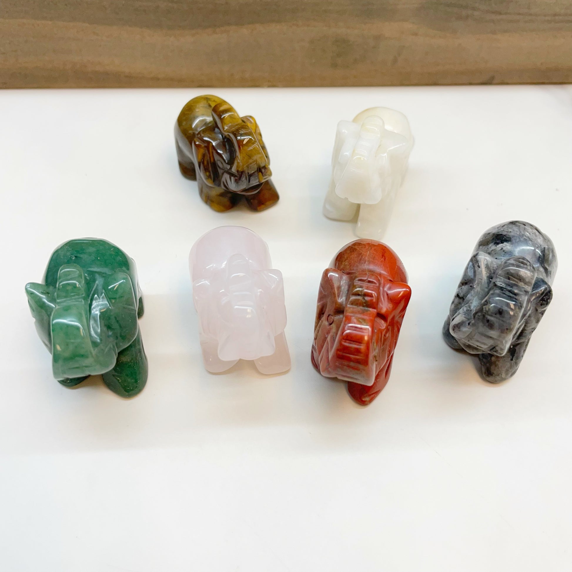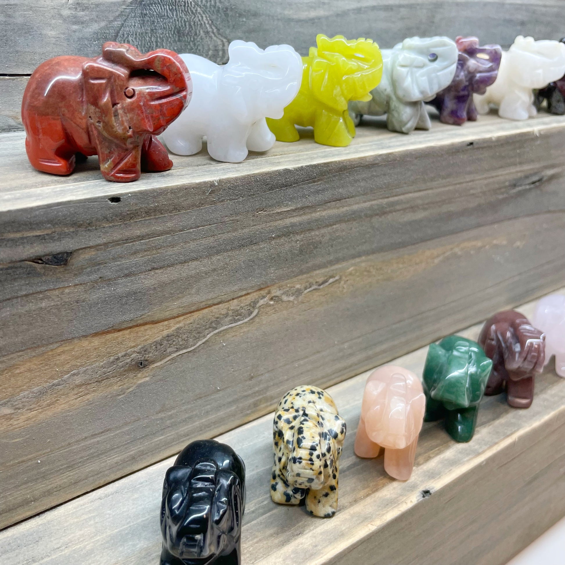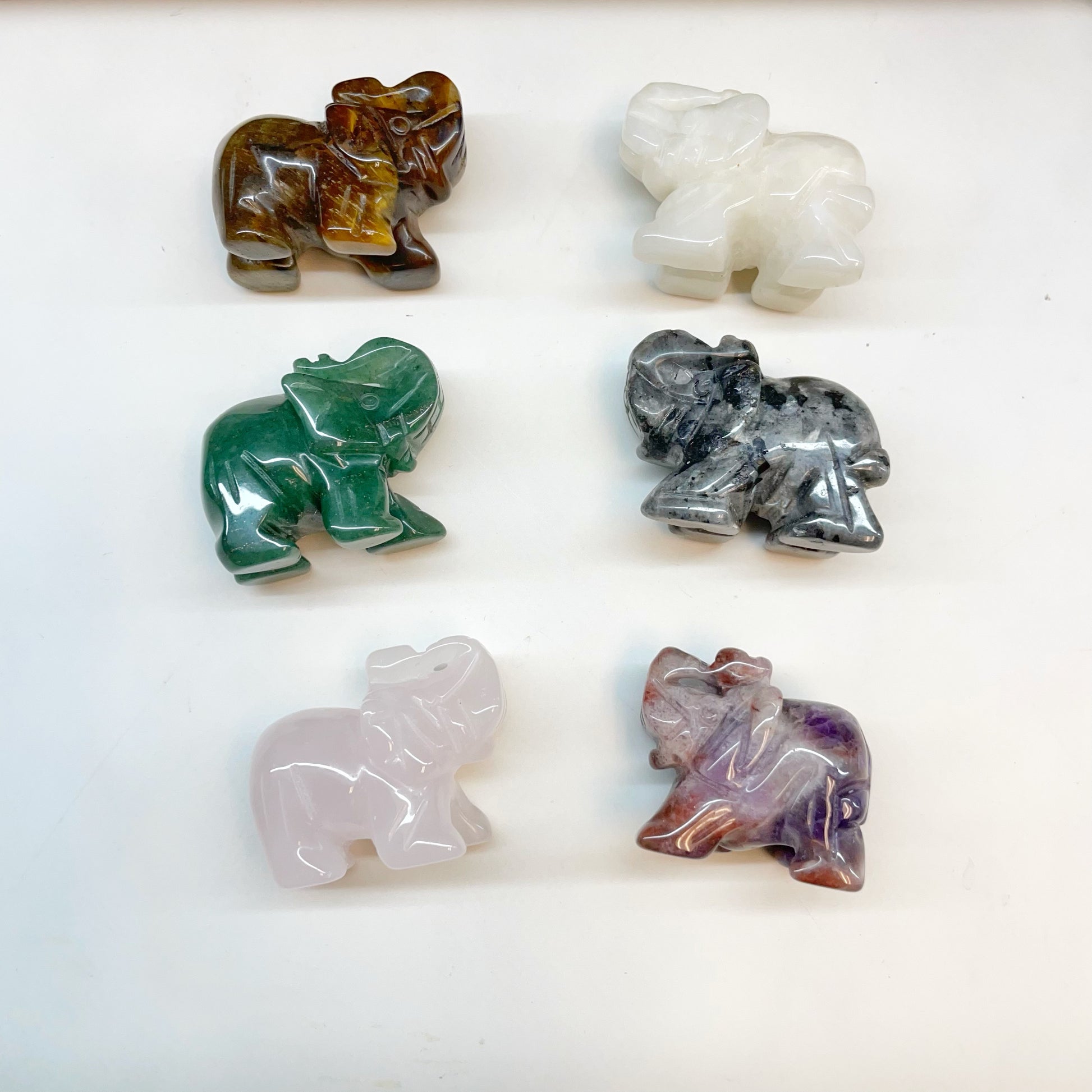 Step into a realm of luck and grace with our gemstone lucky elephant figurine—an embodiment of timeless elegance and spiritual wisdom. Each figurine is meticulously crafted from genuine gemstone, with the trunk elegantly raised in a symbol of prosperity and good fortune. These majestic elephants serve as guardians of positive energy, radiating the unique properties of their gemstone material. Whether it's the soothing energy of amethyst, the nurturing vibes of rose quartz, or the abundance of jade, each figurine carries its own distinct aura of positivity and protection.