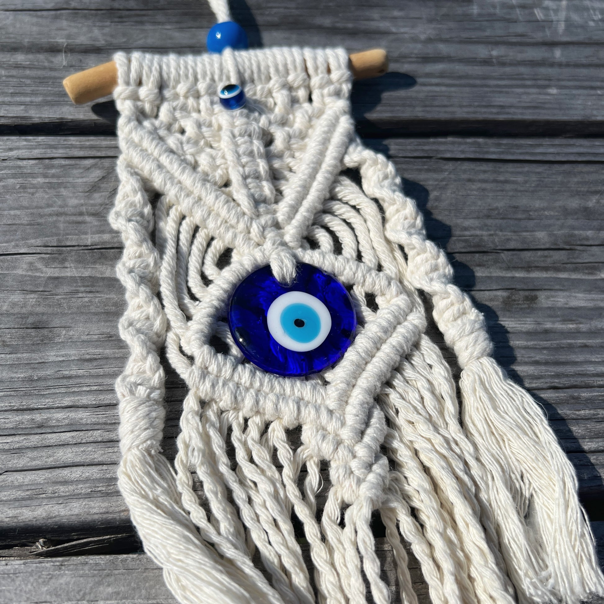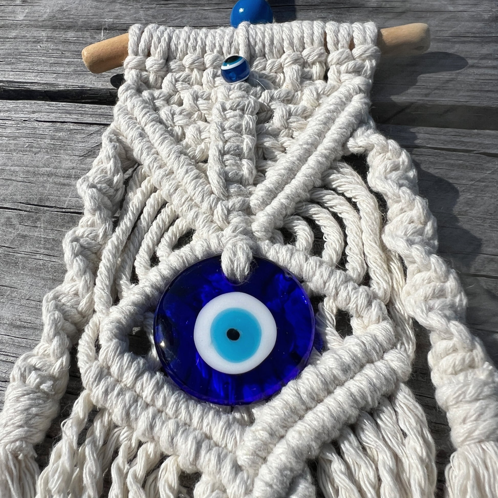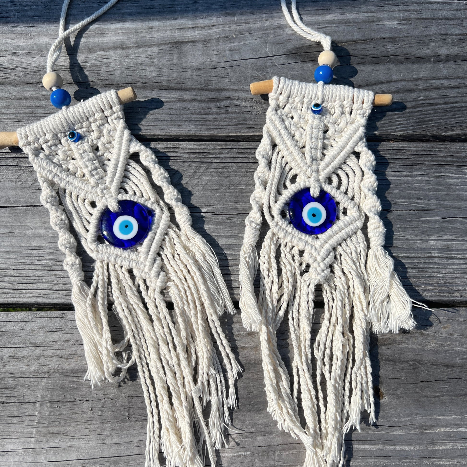 Add a touch of mystique and protection to your space with our Macramé Handmade Evil Eye Wall Hanging. Skillfully crafted with intricate macramé knots, this stunning piece combines bohemian style with ancient symbolism to create a captivating statement for any room. The centerpiece of this wall hanging is the iconic evil eye, a symbol of protection believed to ward off negative energy and bring good fortune.Whether displayed in your home, office, or meditation space, our wall hanging is more than just a decorative accent—it's a powerful talisman that infuses your environment with positive vibes and spiritual significance.