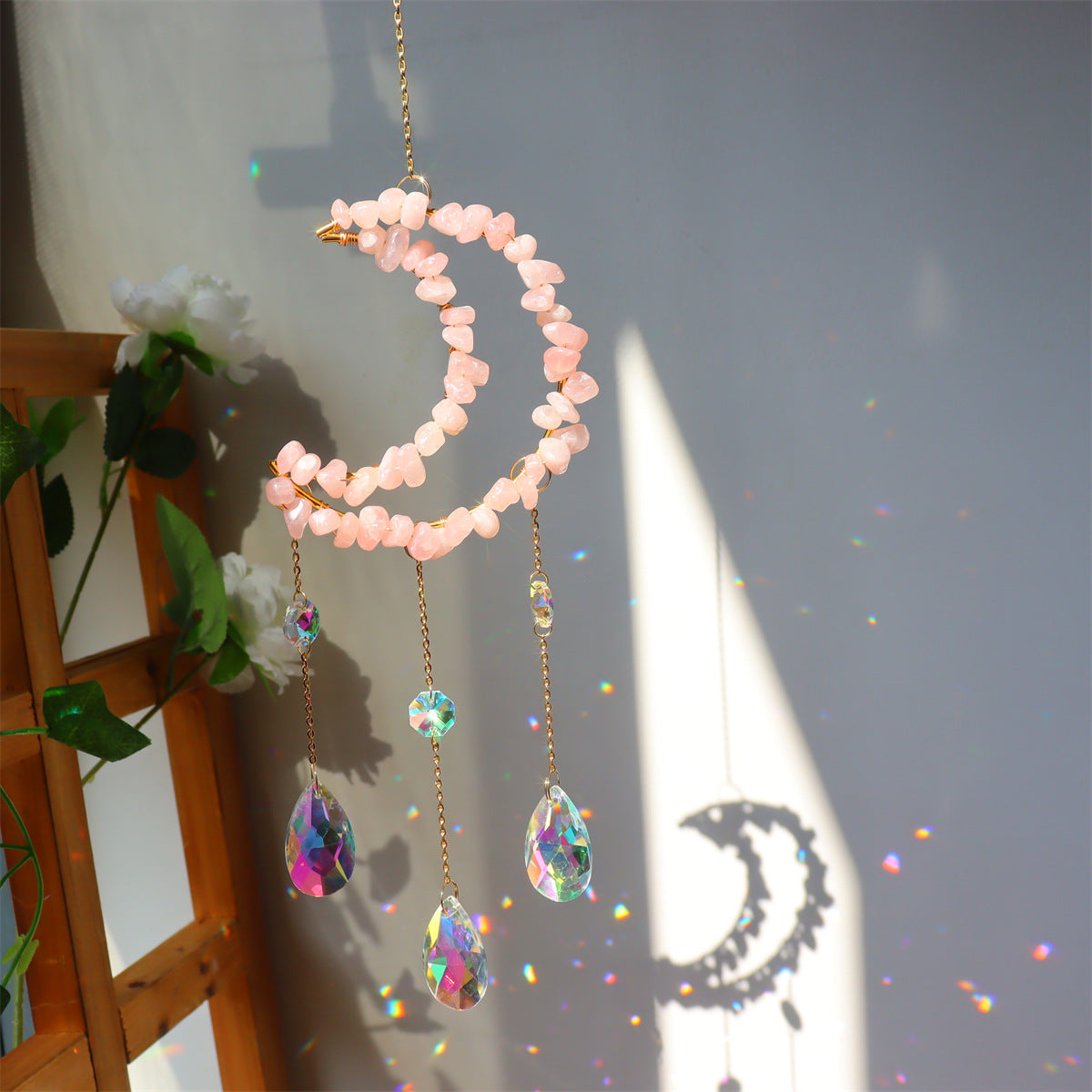 Capture the beauty of light with the crystal suncatcher, a stunning piece that reflects shimmering rainbows when hit by sunlight. Featuring a crescent moon design adorned with dazzling crystals, this suncatcher enhances any space with its mystical charm and sparkling elegance. Ideal for windows, gardens, or as a decorative accent in your home, it adds a touch of magic and serenity, creating a calming and enchanting atmosphere. Perfect for those who appreciate celestial beauty and the peaceful energy of crystal decor.