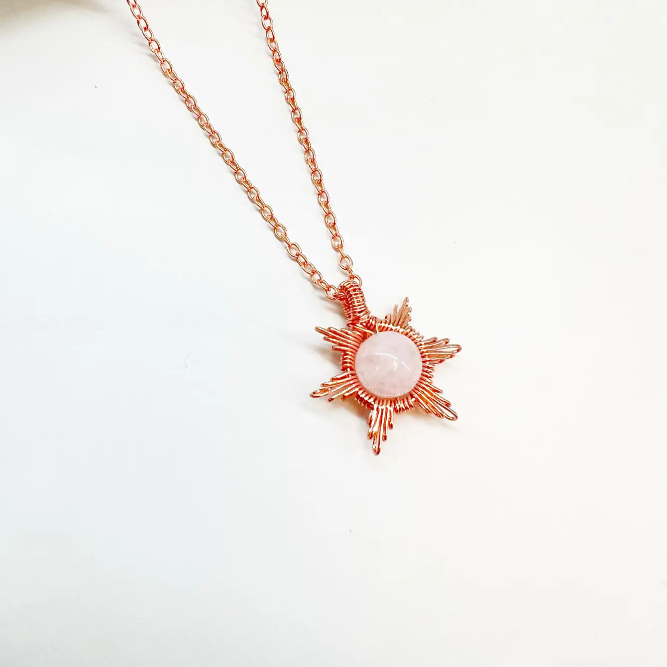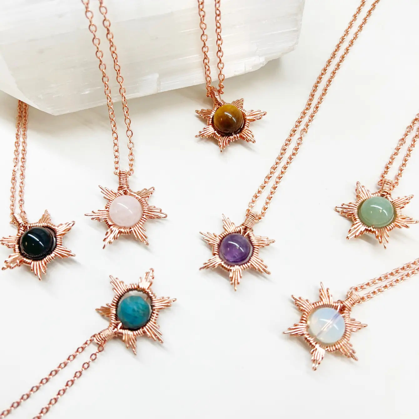 Embrace the warm and captivating allure of the sun with this exquisite necklace. The wire-wrapped design beautifully captures the essence of a rising sun, radiating positivity and vitality.